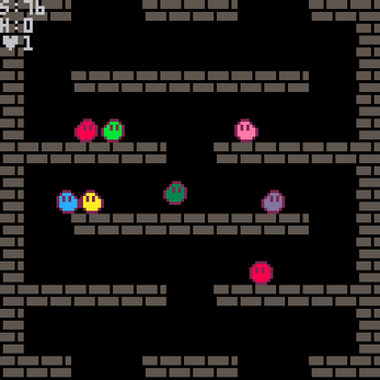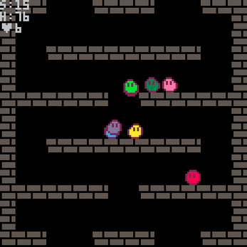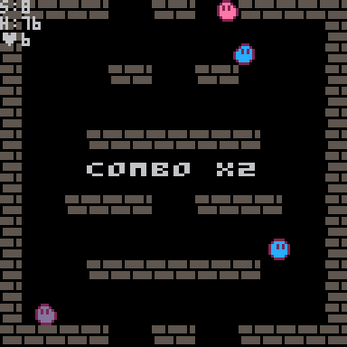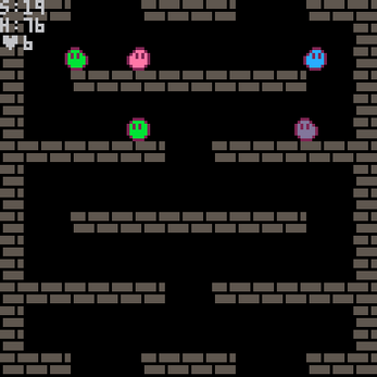 poke(24405,0)cls()?"\f4\^:c70101e101017901\^:e380808780809e80\^:9f0101610101f101\^:f980808680808f80\^:c70101f901017f01\^:e380809f8080fe80\^:c701010101417101\^:e380808080828e80\^:c701013901019981\^:e380809e80809c80\f5\^:dfdfdf00fefefe00\n\f4\^:01e10101790101c7\^:808780809e8080e3\^:01790101f101019f\^:809e80808f8080f9\^:01f901017f0101c7\^:809f8080fe8080e3\^:01f901017f0101c7\^:809f8080fe8080e3\^:81f901013f0101c7\^:809f8080fe8080e3\^:003c56567e7e3c00\^:003854567e7e3c00\b\b\f2\^:3c42a9a98181423c\^:3844aaa98181423c" poke(24405,96)function z(q,x,y)return sget((q.x+x)\8+l%5*16,(q.y+y)\8)end _set_fps(60)h=0::r::s=0l=1g=1v=8m="ready!"?"\asfcdeedee" ::s::n=0t=60c=0d=0r={i=0,s=26,c=8,x=64,y=64,u=1,v=0}p={r}for i=0,6do add(p,{i=i+1,s=27,c=i+8,x=(i^^5)*14+8,y=4+i,u=1,v=1})end ::_::cls()f=l/100+.6pal(9,3,1)t=max(t-1)d=max(d-1)for i=0,255do if(sget(i%16+l%5*16,i\16)>0)spr(10,i%16*8,i\16*8) end if(d<1)c=0 for q in all(p)do if t<1do if(#p<2)t=60m="level complete!"n=1 if(n>2)h=max(h,s)goto r if(n>1)goto s if(n>0)l+=1goto s if q.i<1do q.y+=q.v q.v=min(4,q.v+.1)a=btn()\2%2-btn()%2 if(a!=0)q.x+=a q.u=a if(z(q,0,1)+z(q,0,7-q.v)>0)q.x-=q.x%8-8 if(z(q,8,1)+z(q,8,7-q.v)>0)q.x-=q.x%8 if z(q,1,8)+z(q,7,8)>0do if(q.v>0)q.v=0q.y-=q.y%8 if(btnp(4))q.v=-2.2 end if(z(q,1,0)+z(q,7,0)>0)q.v=max(q.v)q.y-=q.y%8-8 else for i=1,g do if z(q,1,8)+z(q,7,8)>0do if(q.v>0)q.v=0q.u=rnd(2)\1*2-1 q.x+=q.u if(z(q,q.u>0and 8or 0,4)>0)q.u=-q.u else q.y+=1q.v=1end if t<1and abs(q.x-r.x)<5and abs(q.y-r.y)<5do if q.c!=r.c do t=60v-=1if v<1do m="game over"n=3 else m="ouch!!!"n=2?"\as8edc" end else del(p,q)s+=1<<c r.c+=1c+=1d=256t=60m="combo x"..c?"\as8cde" end end end end end q.y%=128pal(4,q.c)spr(q.s,q.x,q.y,1,1,q.u<0) end g+=f-g\1 ?"s:"..s,0,0,6 ?"h:"..h ?"♥"..v if(t>0)?"\^w\^h"..m,64-4*#m,60,6 flip()goto _