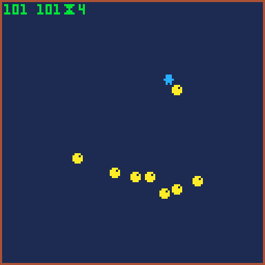p[i]={x=rnd(f),y=rnd(f)}end::_::cls(1)t+=1/60c=t%10<5and 10or 8rect(0,0,127,127,4)b=btn()x+=(b&2)/2-(b&1)y+=(b&8)/8-(b&4)/4x=z(3,x,f)y=z(3,y,f)for i,q in pairs(p)do